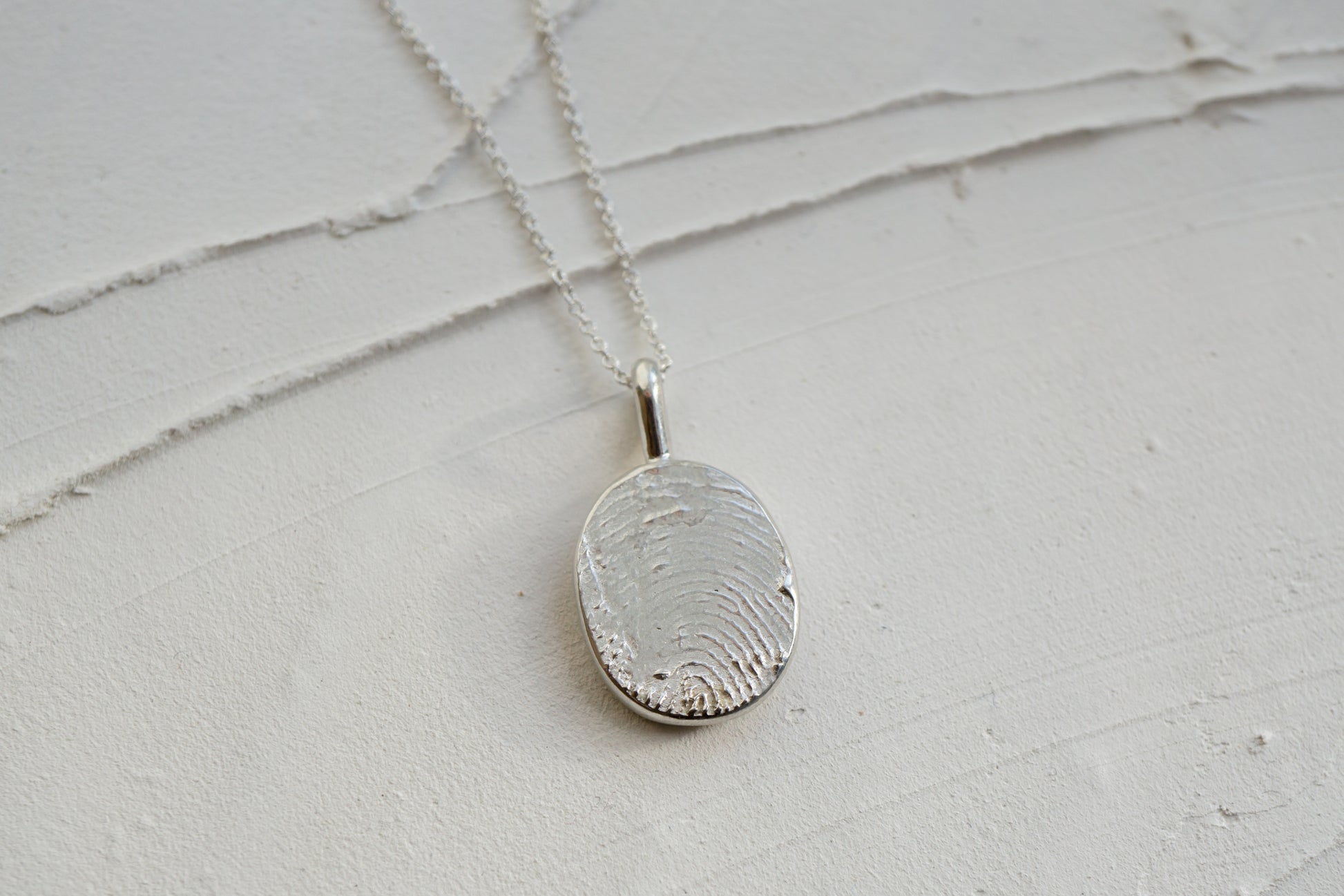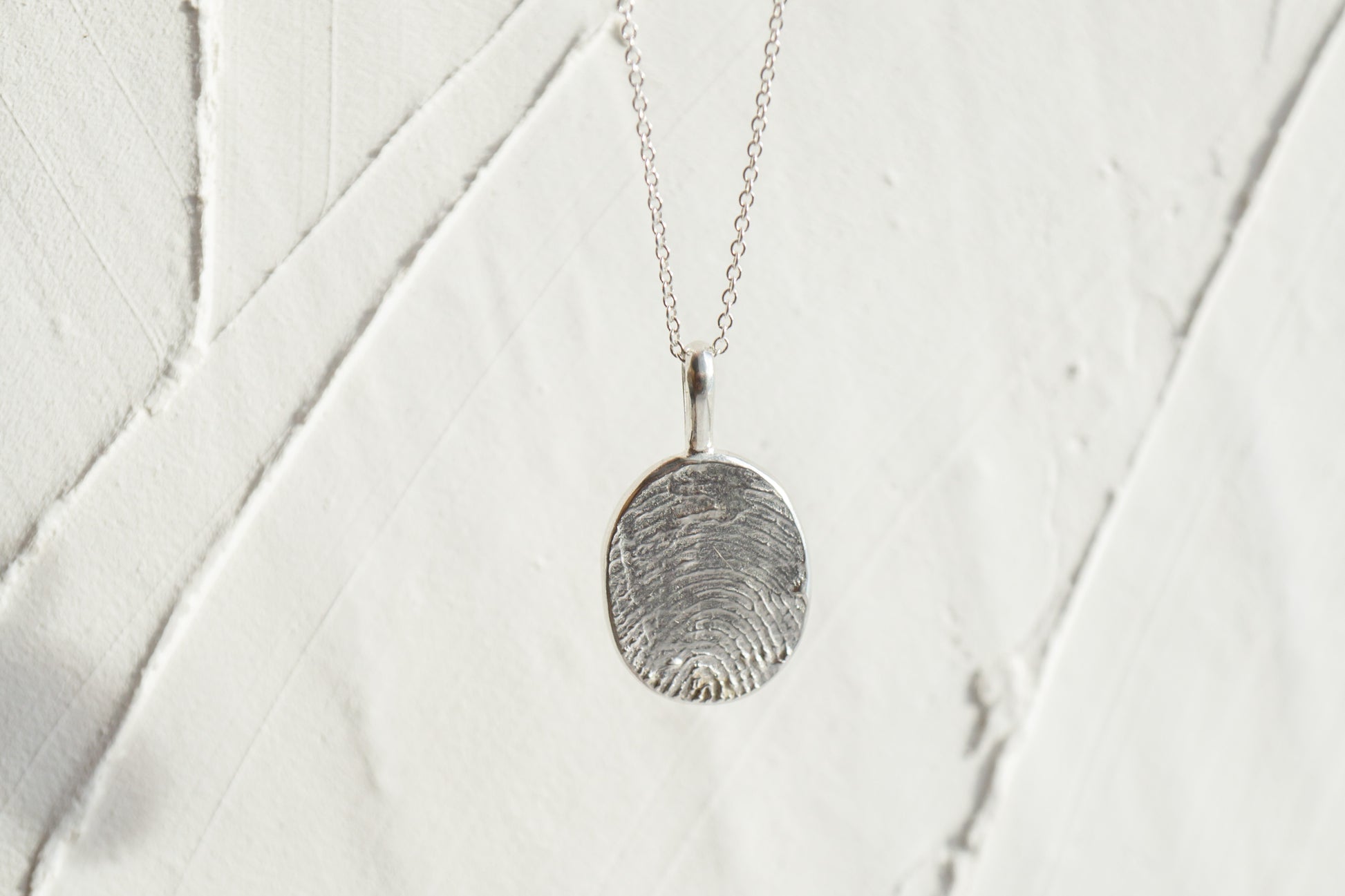 Our Fingerprint necklace is a truly one of a kind talisman to hold your love one's unique touch close to your heart. This necklace is an alternative option for those that are not able to take a physical fingerprint but do have an ink imprint or a digital copy. We'll simply get that imprint 3D printed, then designing and casting it into the most meaningful keepsake. Each piece is unique to every individual, complimenting the soft and organic shape of the finger. From newborn to the elderly, the fingerprint necklace represents an everlasting memory of that special someone in your life.